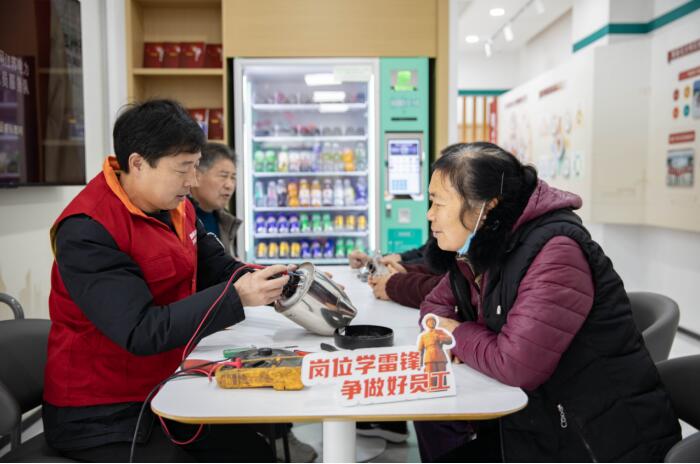 电力志愿者在城市暖空间为居民提供电器修理便民服务