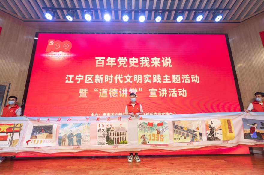 活动中,由中国药科大学千余名师生共同绘制的“绘百年荣光,颂千秋伟业”百米长卷也展现在现场,画卷由“开天辟地,完成救国大业”“改天换地,完成兴国大业”“翻天覆地,推进富国大业”“惊天动地,推进强国大业”四个篇章组成,通过100个历史重大事件,讲述中国共产党从新民主主义革命时期到建设中国特色社会主义新时代的奋斗史、创业史、发展史,传递爱党爱国的心声。(江宁区文明办)