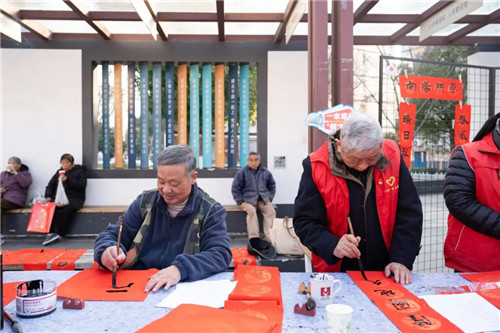 写春联送祝福作为此次阳光市集的一大亮点,吸引了众多书法爱好者和居民的参与。书法老师们挥毫泼墨,笔走龙蛇,志愿者们将写好的春联一一排列整齐,供前来的居民观赏挑选,大家相互讨论着每幅对联的寓意,手里拿着写好的春联和街坊邻里互道祝福。