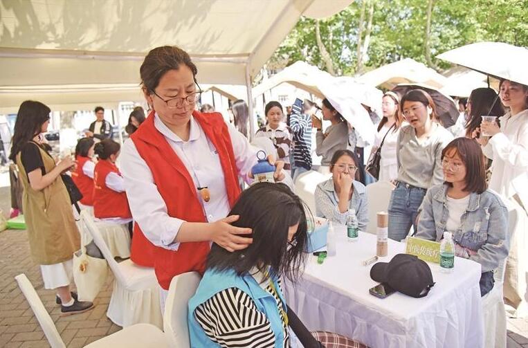 中医诊疗体验区“烟火气”十足,康复科、呼吸内科及中医传统疗法等7个科室前排起长队。铜山区中医院的专家团队“望舌把脉”,针对失眠、焦虑等学生常见问题开具个性化调养方案。现场一位医生表示:“此类活动不仅能让更多年轻人感受到传统中医文化的博大精深,还能实现不出校门就能与中医专家面对面就诊,让大学生真切感受到更为优质、便捷的传统中医诊疗服务。