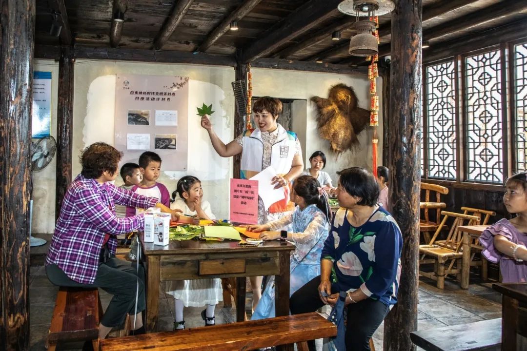 古县街道百家塘村老茶馆内,“童享自然韵 树叶有‘画’说”亲子活动温情上线。孩子们在志愿者的指导下,用五彩树叶创作贴画,观察叶脉纹理、拼接自然灵感,剪贴之间将秋日落叶化作“小刺猬”“金鱼戏水”等童趣作品。亲子协作的温馨场景与老茶馆的古韵相映成趣,让自然美育浸润童心。