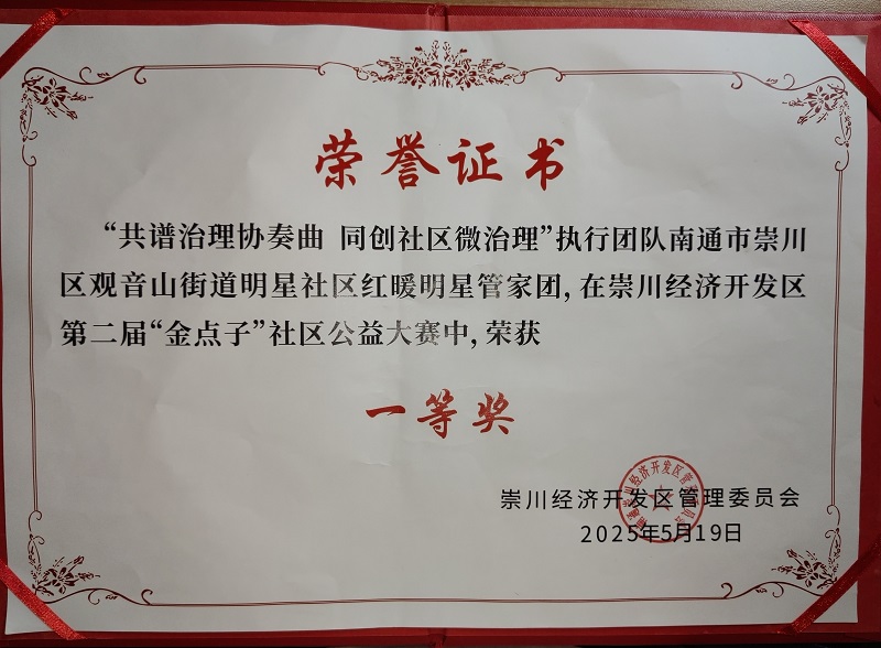 2024年来,“红暖明星”管家团的《共谱治理协奏曲,同创社区微治理》项目在崇川经济开发区第二届社会公益项目“金点子”大赛中获得一等奖。社区党委书记王建春说:“小区治理是一个常态化的工作,正是由于管家团内有这样一批热心人、有心人,小区治理才能更上一个台阶,居民们才能不断感受到平安、幸福和快乐?!?/p>