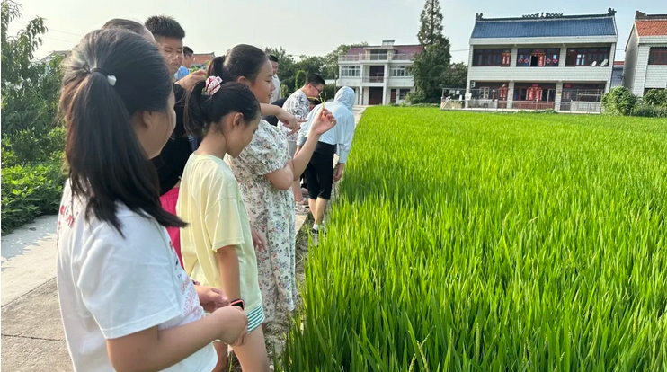 “现在水稻生长正处于抽穗期,大家仔细观察,是不是水稻的中心都开始长出花穗了?”松杨社区的阡陌田野间,志愿者正耐心细致地为孩子们讲解着水稻的生长特性及环境需求。稚嫩的面庞贴着稻秆,全神贯注地观察着稻叶。
