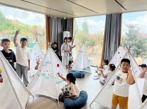 一顶顶洁白的小帐篷,给孩子们带来无尽的童话想象。在志愿者的指导下,小小画家们执起画笔,蘸上颜料,与小伙伴相互配合,认真调色,涂涂画画,在帐篷上施展“魔法”,尽显想象力。不一会儿,原本白色的帐篷被装点得五彩斑斓,各式各样的图案展示出孩子们丰富的内心世界。家长们在一旁协助,亲子间的默契在互动中升温,欢声笑语回荡在活动场地。