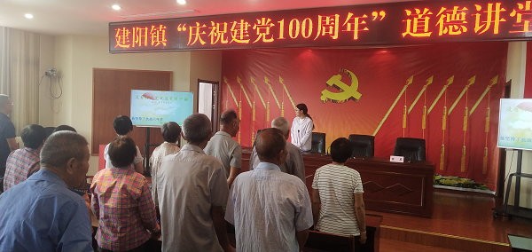 “他建设了敌后根据地,他实行了民主好处多。没有共产党就没有新中国......”7月9日上午,建湖县建阳镇新时代文明实践所内传出了阵阵慷慨激昂的歌声,该镇“庆祝建党100周年”主题道德讲堂正在进行中,100余位党员代表参加。