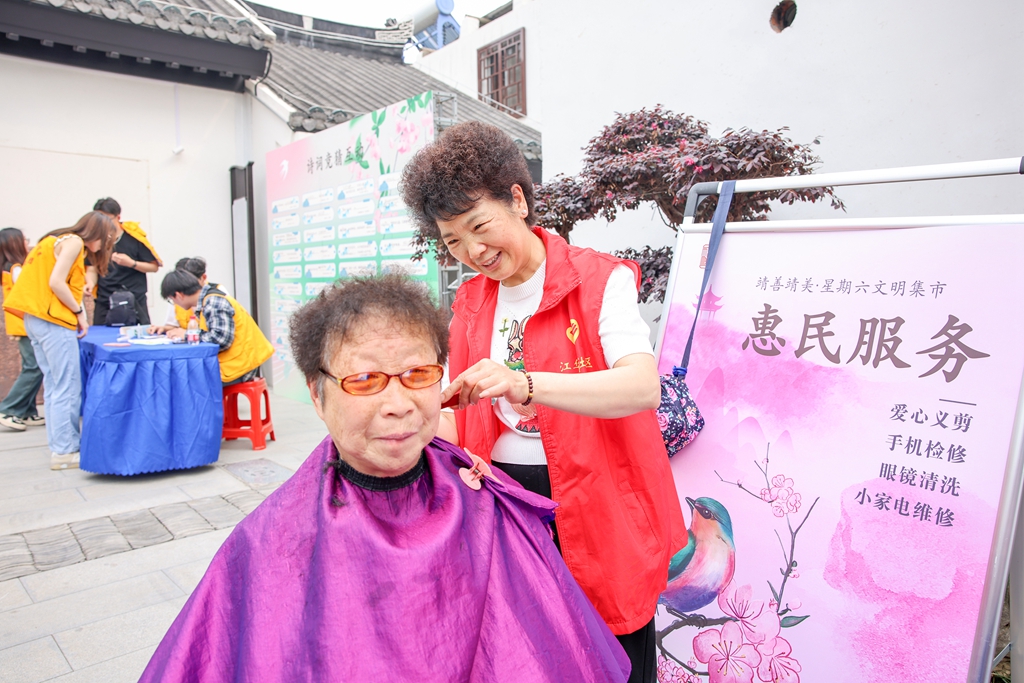 “社??梢酝ü⑿判〕绦蚪赡?,我来教您”……在政策宣传区,来自靖江市公安局、医保局、人社局、住房公积金管理中心的志愿者主动向大家宣传各类最新政策,解答他们提出的问题?;菝穹袂闹驹刚呙且裁Φ貌豢煽?,他们热情地为市民群众提供爱心义剪、小家电维修、眼镜清洗等服务?!拔沂且幻矸⒌甑曛鳎彩蔷赋墙值澜缜闹驹刚?,今天特地参与到活动中来为居民们提供免费理发服务?!敝驹刚吖私ɡ妓?。