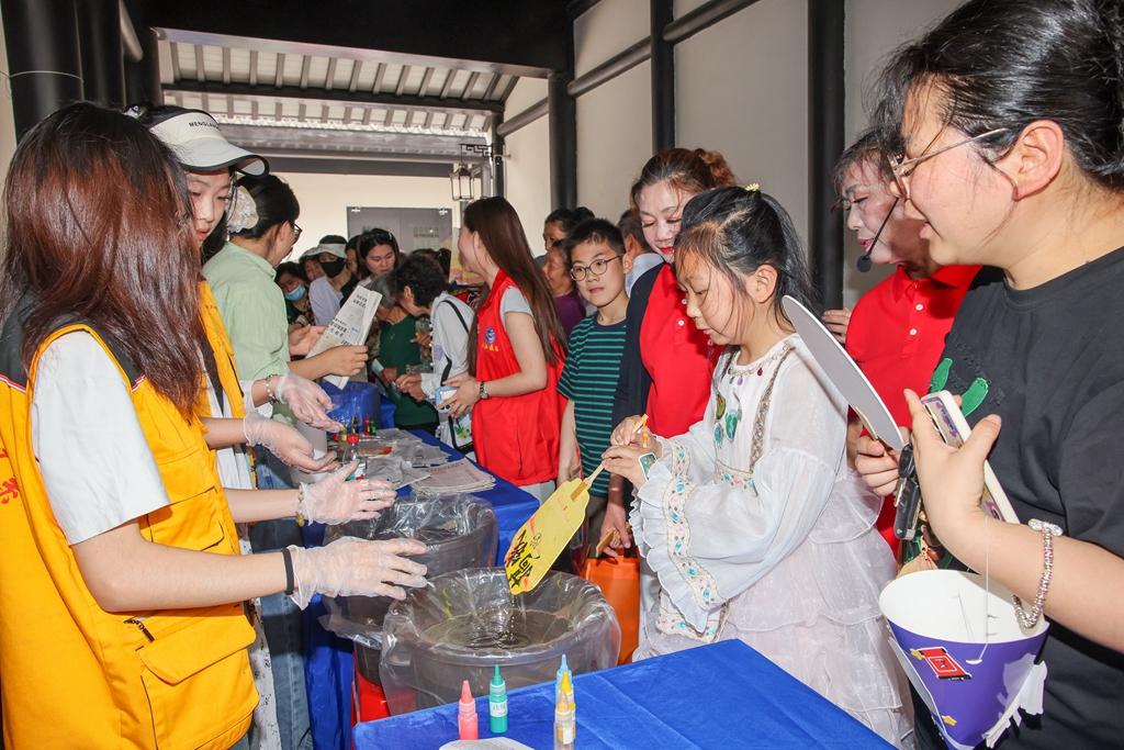 各类活动具有很强的趣味性和互动性,适合不同年龄段人群?!袄掷唷比の洞蟠彻?、“变废为宝”塑料瓶回收、创意环保帽子DIY等游戏,让小朋友们在潜移默化中提升绿色环保理念。现场人气最高的莫过于非遗体验区,大家排起长队,只为制作一把独一无二的漆扇,香囊制作、风筝制作等也聚集了超高人气。