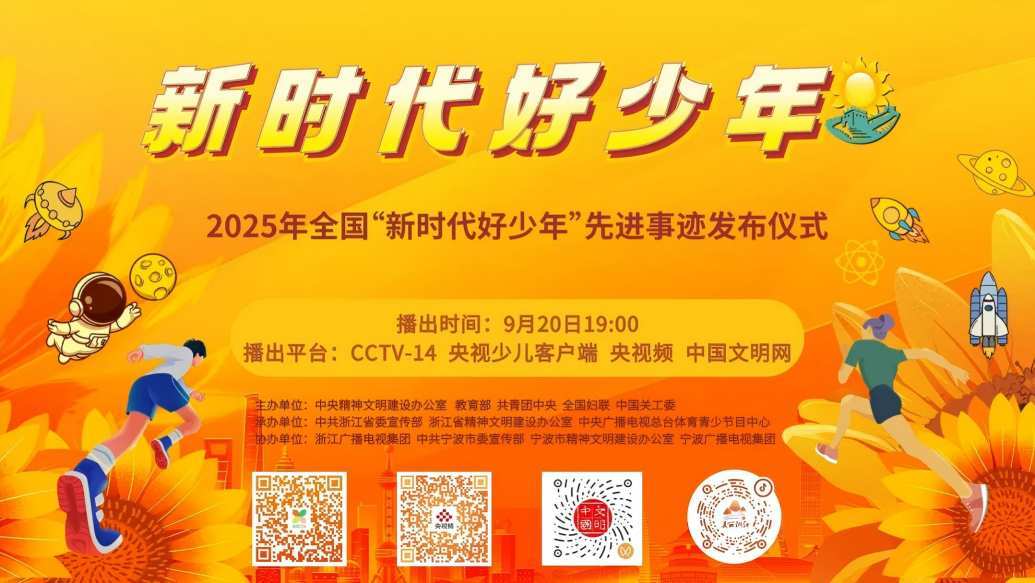 9月20日(星期六)19:00,由中央精神文明建设办公室、教育部、共青团中央、全国妇联、中国关工委联合举办的2025年全国“新时代好少年”先进事迹发布仪式将在CCTV-14、央视少儿客户端、央视网、中国文明网播出。