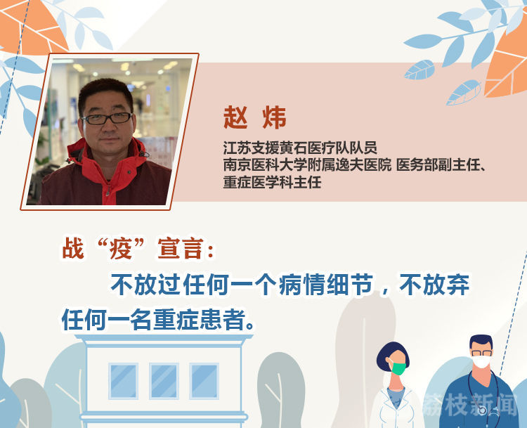 抗击过“非典”、禽流感,支援过汶川救援工作,作为一位经验丰富的专家,赵炜被任命为黄石市中心医院重症医学科业务主任及黄石市新型冠状病毒肺炎防疫专家组成员,主要负责NCP危重型病人的救治工作。