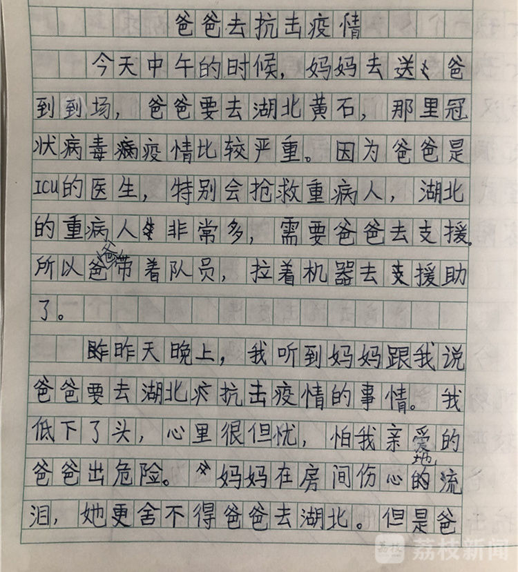 “今天中午的时候,妈妈去机场送爸爸,爸爸要去湖北黄石。因为爸爸是ICU的医生,特别会抢救重症病人,湖北的重症病人非常多,需要爸爸去支援,所以爸爸带着队员、拉着机器去援助了……”