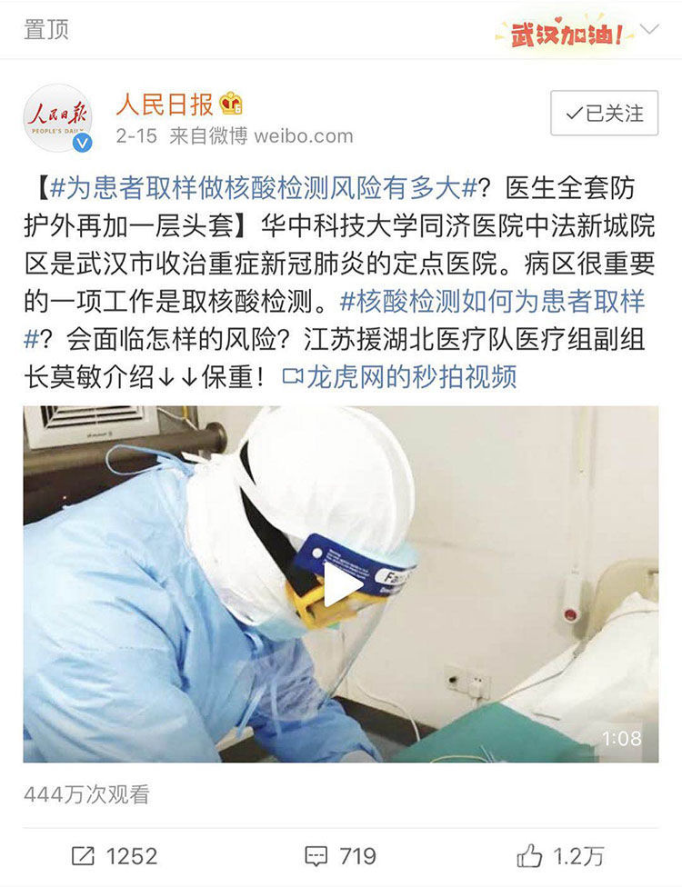 2月15日,《人民日报》官方微博转发了一条名为《为患者取样做核酸检测风险有多大?》的视频。视频讲述了重症病区的医生为患者取样做核酸检测的过程,因为内容真实、生动,极具科普价值而在网友中广泛传播。视频的主角,正是莫敏。