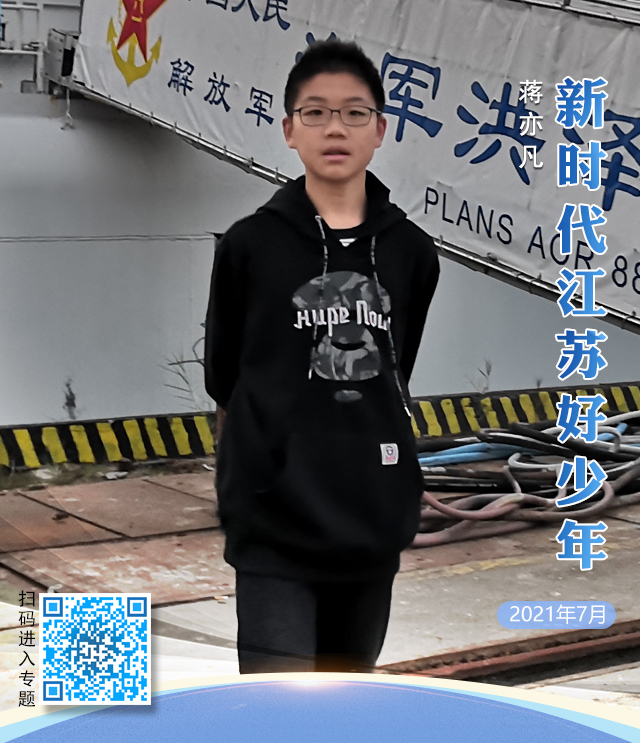 蒋亦凡,男,2008年3月出生,泰州市高港实验学校七(1)班学生。蒋亦凡喜欢读红色书籍、看红色电影、听红色故事,他积极参加“红色印记”红色歌曲合唱、“百年党史 百名师生 百集宣讲”系列活动、“学党史、强信念、跟党走”主题团日演讲比赛、“童心向党”系列主题教育实践等活动,被学校评为“最受欢迎的小讲解员”。2019年,蒋亦凡在全省乡村学校少年宫优秀成果展演活动中,向来访人员详细介绍了泰州舰138号及中国人民海军发展历程,大方的谈吐、清晰的解说,受到大家的一致好评。他还利用课余时间在中国人民解放军海军诞生纪念馆担任志愿小讲解员,目前已义务讲解50多场次,讲解时长约50多小时,服务游客2000多人次。他希望通过自己的努力,继续做好家乡“海军文化”的宣传者和践行者,让更多人认识泰州、了解泰州、喜欢泰州 。